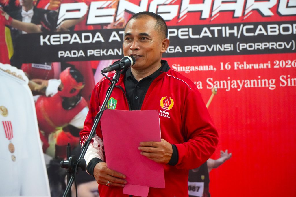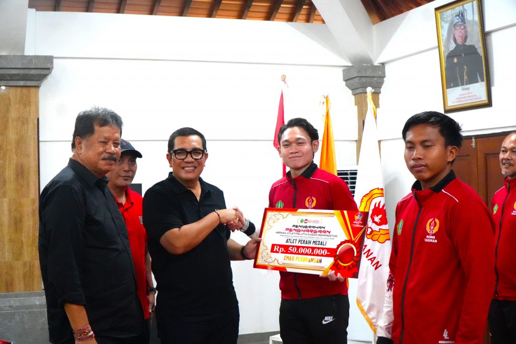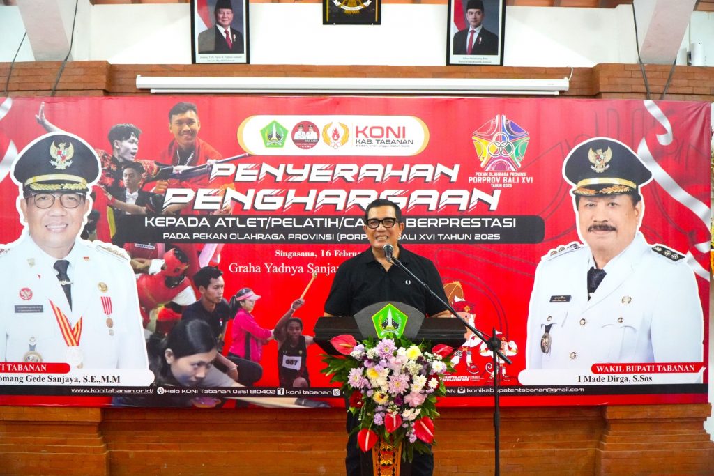 Bupati Tabanan, I Komang Gede Sanjaya, menyerahkan penghargaan kepada atlet dan pelatih berprestasi yang telah mengharumkan nama daerah pada ajang Pekan Olahraga Provinsi Bali XVI 2025. Penyerahan penghargaan berlangsung di Gedung Graha Yadnya Sanjayaning Singasana, Desa Adat Kota Tabanan, Senin (16/2/2026), sebagai bentuk apresiasi atas capaian membanggakan kontingen Tabanan.